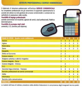 Il diplomato di istruzione professionale nell’indirizzo SERVIZI COMMERCIALI ha competenze professionali che gli consentono di supportare operativamente le aziende del settore sia nella gestione dei processi amministrativi e commerciali sia nell’attività di promozione delle vendite.